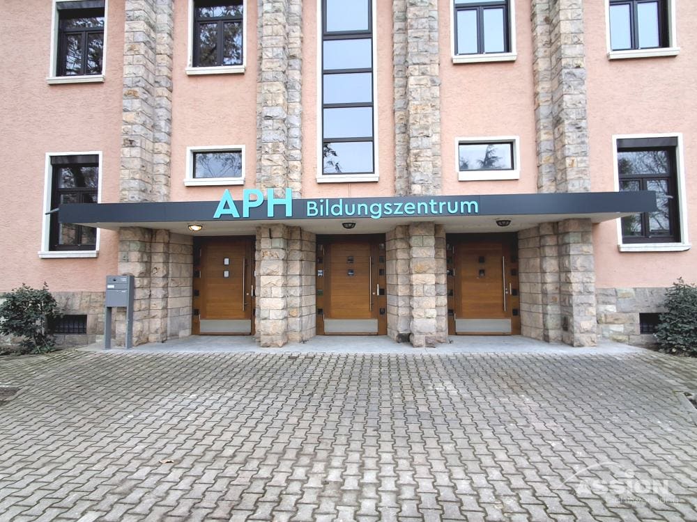 Für eine saubere Ästhetik nutzen wir meist rückseitige Distanzhalter. Diese werden auf der Rückseite der Buchstaben fixiert und rasten in entsprechende Wandmuffen ein. Dadurch schweben die Buchstaben mit einem kleinen Abstand vor der Fassade, was einen attraktiven Schattenschlag erzeugt. Damit alles perfekt sitzt, arbeiten wir bei der Installation grundsätzlich mit einer präzisen Montageschablone.